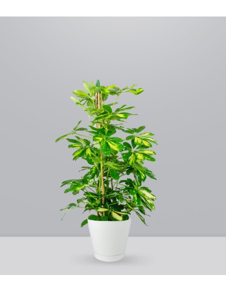 La Schefflera Gold Capella è una pianta alta da interno molto rinomata e conosciuta per il suo fogliame verde variegato, come suggerisce il nome, di un bel color oro-giallo e per la sua facilità di cura.