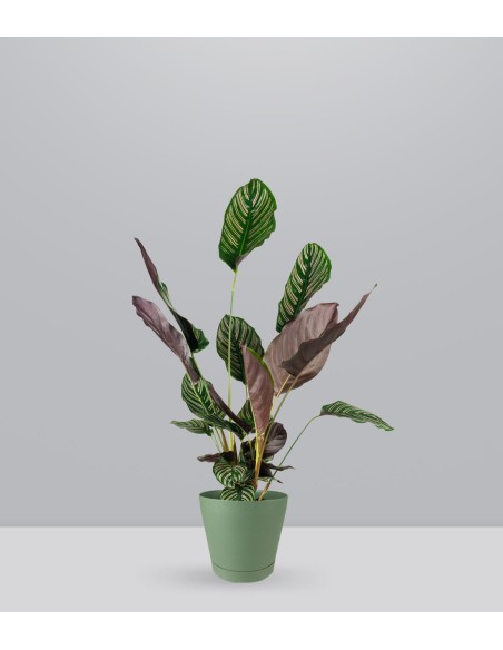 La Calathea Sanderiana è una pianta che porta l'esotico nelle case con il suo straordinario fogliame, capace di trasformare ogni angolo in un angolo di paradiso verde. Con la sua eleganza e i suoi colori vibranti, questa pianta tropicale si distingue per la bellezza delle sue foglie arricchite da venature eleganti di colore rosa. Alta circa 80 cm, la Calathea è la scelta ideale per chi cerca una pianta decorativa, facile da curare e capace di adattarsi a diversi ambienti.