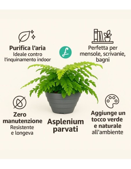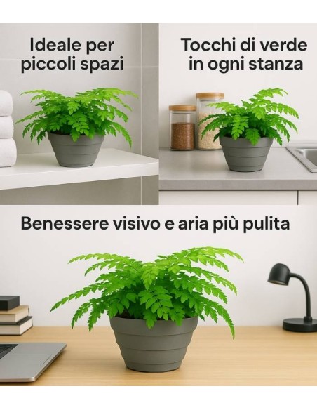 L'Asplenium ha un portamento ricadente con una chioma leggera e delicata che crea un effetto affascinante e vivace soprattutto se posizionato su mensole o mobili, creando anche un bel contrasto per il colore verde acceso che la caratterizza.