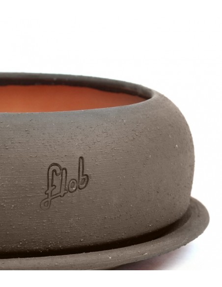 La forma essenziale delle superfici deriva dall'ispirazione zen, connubio perfetto con l'arte orientale del bonsai. Il movimento circolare del tornio con cui il vasaio crea questi sottovasi imprime delle naturali venature circolari alla superficie che successivamente viene colorata a mano lasciando grezza solo la pare centrale su cui viene inciso il logo Flob.