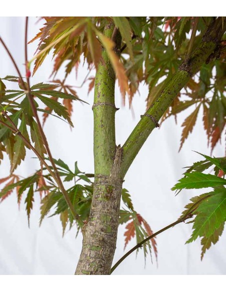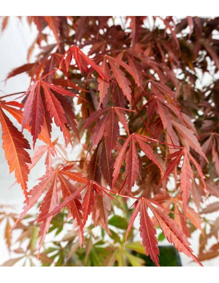 Le foglie palmate dell'acero rosso giapponese si tingono di un caldo rosso arancio che è uno spettacolo per gli occhi. Il tronco racconta la storia di questo albero e aggiunge un tocco di eleganza.