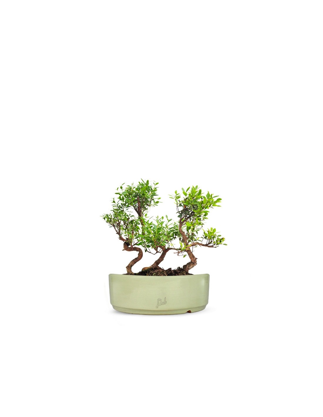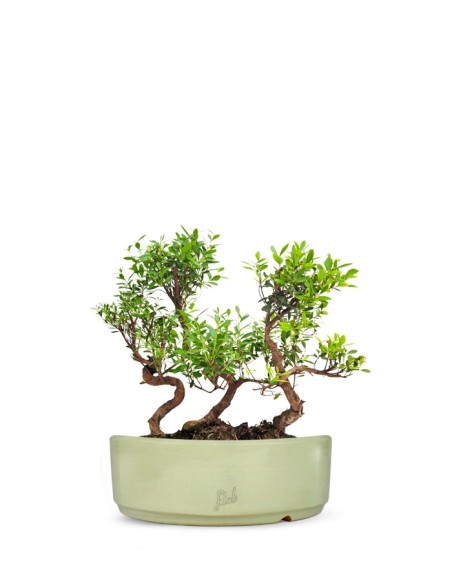 Gli antichi greci e romani associavano questa pianta all'amore e alla verginità e per questa ragione i ramoscelli di mirto con i loro delicati fiori bianchi sono speso usati nei bouquet nuziali e nelle corone delle spose. In questo caso lo ritroviamo in una composizione a boschetto, che da vita ad un bonsai davvero particolare, sinuoso ed elegante.