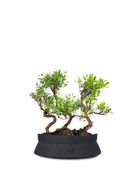 Gli antichi greci e romani associavano questa pianta all'amore e alla verginità e per questa ragione i ramoscelli di mirto con i loro delicati fiori bianchi sono speso usati nei bouquet nuziali e nelle corone delle spose. In questo caso lo ritroviamo in una composizione a boschetto, che da vita ad un bonsai davvero particolare, sinuoso ed elegante.