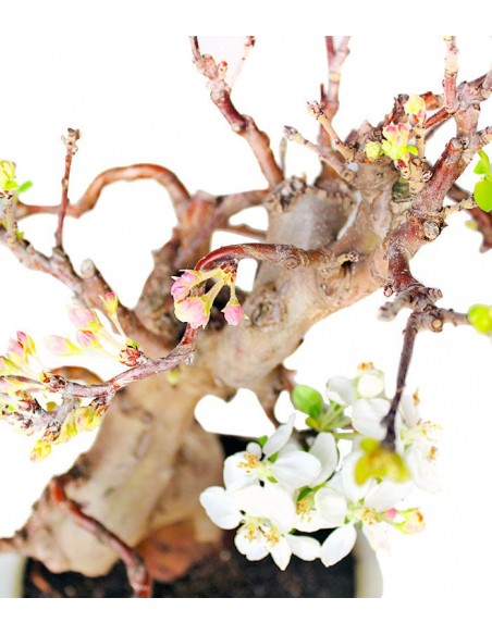 La meraviglia del bonsai di melo sono: la grande quantità di fiori bianchi e la produzione di frutti.