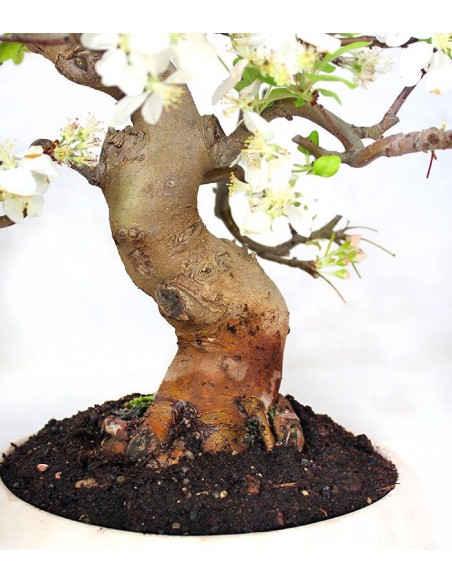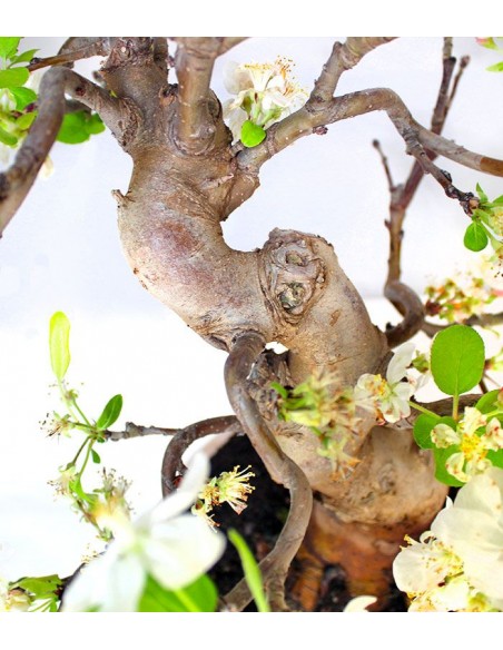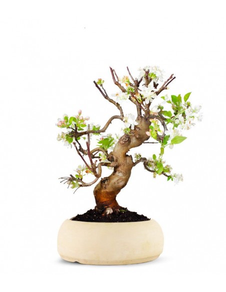 La meraviglia del bonsai di melo sono: la grande quantità di fiori bianchi e la produzione di frutti.