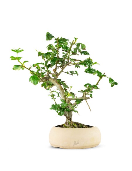 Il bonsai di crataegus cuneata, è una varietà di biancospino dalle caratteristiche uniche. Questo esemplare ha un'altezza di 50 cm e un nebari di 2,5 cm, ed è contenuto in un vaso artigianale in terracotta prodotto in Italia a Marchio FLOB, resistente al freddo e all'acqua.