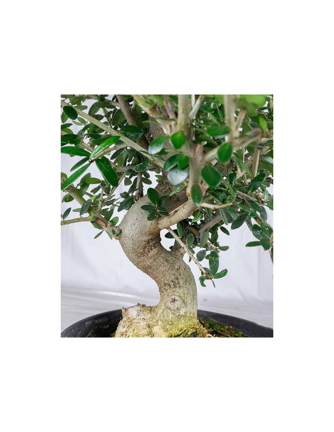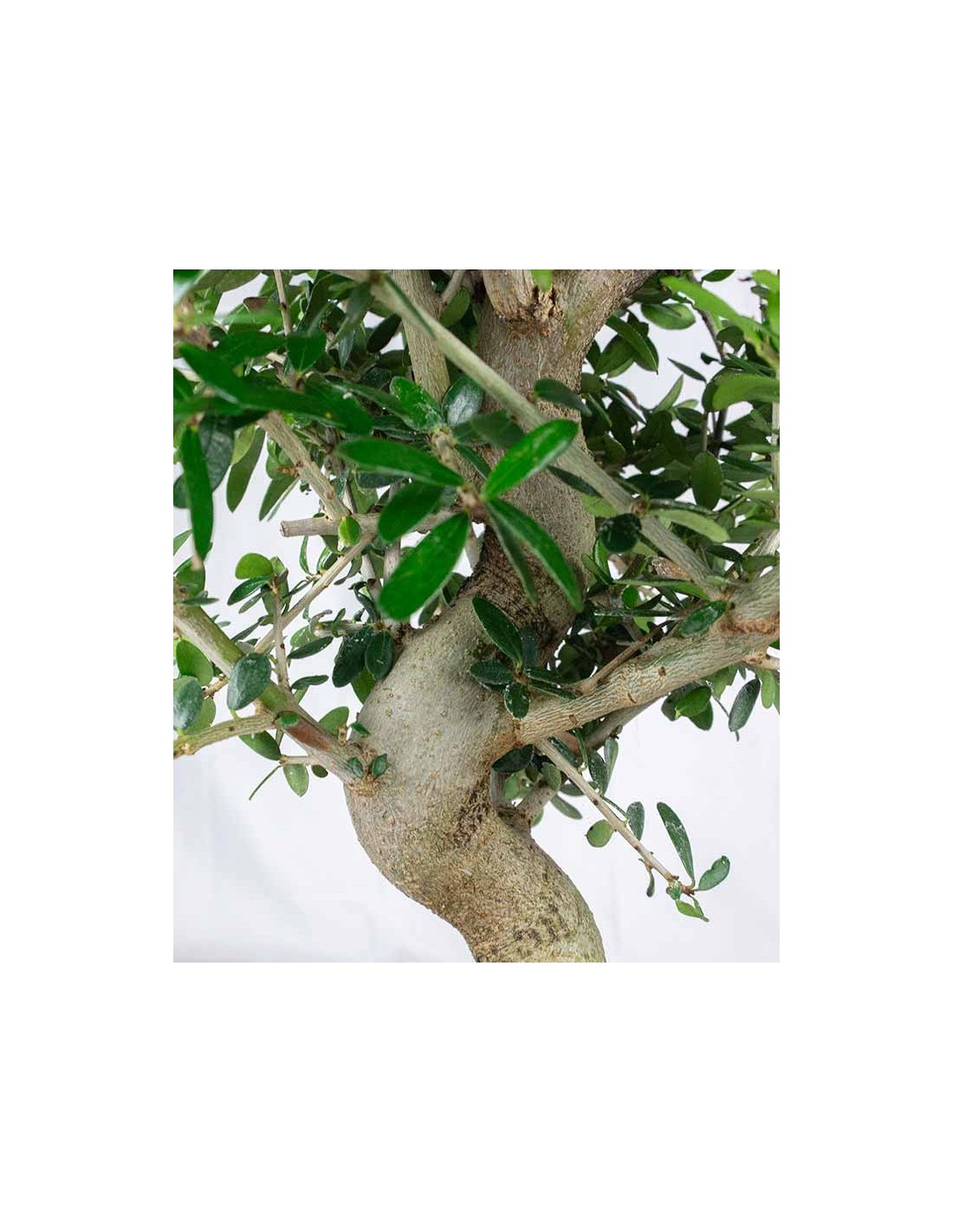 Questo esemplare unico di olivastro bonsai presenta una silhouette che risulta molto armoniosa, creando un'immagine di grande forza e stabilità tipico di questa pianta.