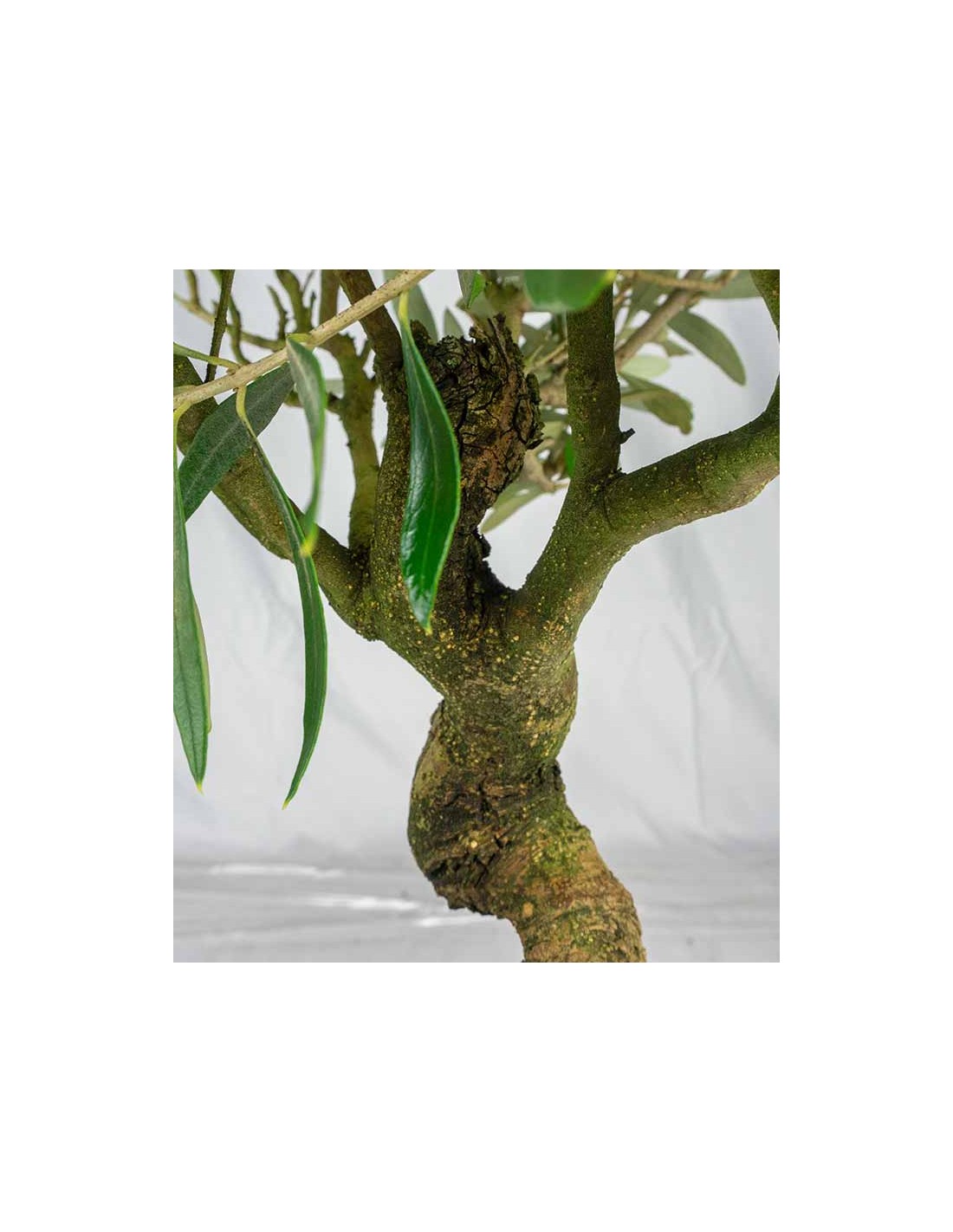 Il particolare tronco, rugoso e nodoso caratteristico dell'olivo, si presenta stabile e robusto, un'opera d'arte della natura in miniatura.