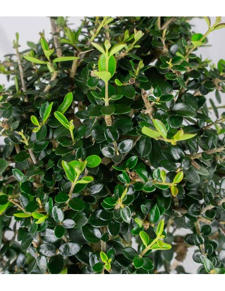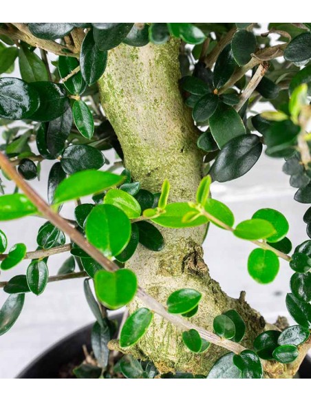 Questo bonsai di Olivastro di 14 anni si presenta con un tronco robusto e possente, una corteccia rugosa e con fitte ramificazioni.