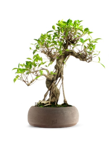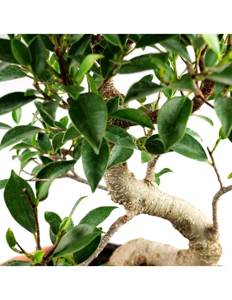 Il tronco è di colore biancastro, mentre il fogliame ha una bella tonalita? di verde intenso ed ogni foglia ha forma ovale ed appuntita. L'aspetto maggiormente caratterizzante di questa pianta sono le spettacolari radici, che creano un affascinante groviglio fuori terra, e proprio per questo è uno dei bonsai che più si adatta allo stile giapponese “Neagari”, ovvero a radici esposte. Inoltre, dai rami spesso partono altre radici aeree, che una volta raggiunta terra formano degli ulteriori tronchi. Il Ficus retusa è particolarmente indicato a chi vuole avvicinarsi al mondo dei bonsai, le sue caratteristiche da pianta da appartamento e la sua longevità lo rendono ideale per coltivare questa passione.