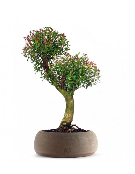 Il Syziygium è originario dell'Asia minore e in natura può raggiungere un'altezza di 2-3 metri: è un elemento importante per le foreste pluviali essendo fonte di cibo per molti animali. In primavera possiede dei fiori bianchi, spesso seguiti da alcune bacche. Il bonsai è di facile coltivazione, ma nei luoghi più freddi va collocato all'interno durante l'inverno. E' detto anche Mirto cinese; appartiene infatti alla stessa famiglia del Mirto e ben si presta all'utilizzo come bonsai grazie alle sue foglie di piccole dimensioni e alla chioma rotondeggiante.