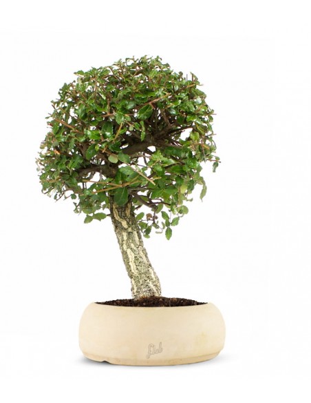 La quercia sughera in forma di bonsai si presenta come una pianta spettacolare per il suo aspetto di enorme e antico albero. ? caratterizzata da foglie molto piccole di un verde intenso, da tronchi molto spessi e da una corteccia ruvida che tende a staccarsi a placche e dalla quale si ricava il sughero. Questo tipo di quercia è un sempreverde e ha un portamento disordinato espanso e per questo assume forme dal forte impatto visivo. Nel periodo tra Maggio e Giugno sviluppa fiori sia maschili, di colore giallo-verde sui rami dell'anno precedente, sia femminili di colore verde sui rami dell'anno corrente. Mentre i frutti nascono successivamente e consistono in ghiande di colore marrone.