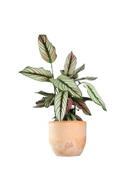 La calathea majestica whitestar presenta un comportamento compatto con foglie grandi caratterizzate da striature rosa-chiare e bianco, colori, che sicuramente si adattano bene a i colori dell'arredo bagno.