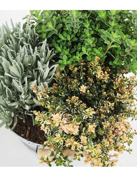 Timo variegato: Il Timo variegato aureo chiamato anche “Timo Anderson Gold” è una pianta arbustiva perenne appartenente alla famiglia delle Lamiaceae. Le foglie sono piccole, lanceolate, di colore verde variegate di giallo. I fiori sono raccolti in spighe di color lilla. Il Timo Variegato con il suo gusto intenso di agrumi è insostituibile in cucina per insaporire e rendere più digeribili molti cibi. Ideale per oli e aceti aromatici ed anche per macedonie, confetture, dolci e sorbetti di frutta. Inoltre è ottimo nella preparazione di cosmetici, grazie alle sue proprietà antisettiche. Grazie a degli impacchi di olio essenziale si può contrastare la pelle impura.