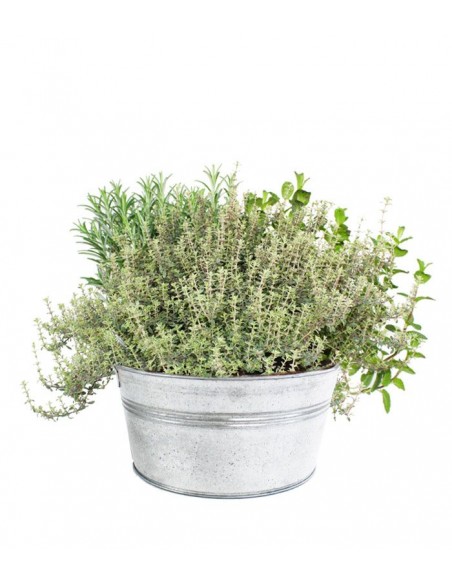 Il vaso è in latta grigia con raffinata zigrinatura. Entrambe le piante non richiedono molta acqua e di conseguenza non tollerano i ristagni. È necessario assicurarsi solamente che il terreno non sia completamente secco e che vengano posizionate in un luogo soleggiato o mezz'ombra avendo cura di ripararle dai forti venti.