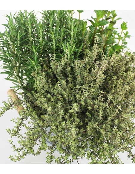 Timo argenteo: Il Timo Argenteo o “Silver Queen”, così come il timo classico, è un arbusto sempreverde e perenne originario dell'area mediterranea. Ha il fusto eretto, legnoso nella parte inferiore, molto ramificato da formare dei cespugli alti 40-50 cm. Le foglie sono piccole, lanceolate, di colore argento variegate di bianco. I fiori sono raccolti in spighe di color lilla. Contrariamente alla maggior parte delle altre erbe aromatiche, con l'essicazione il timo mantiene tutto il suo aroma. Nel Medioevo le dame ricamavano spighe di Timo sulle sciarpe dei cavalieri come buon auspicio per le battaglie.
