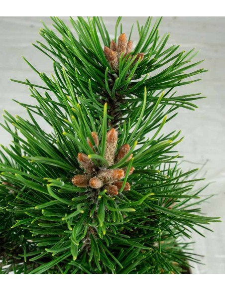 Il Pino mugo anche detto Pino montano o più semplicemente mugo, appartiene alla famiglia delle Pinaceae. È una conifera sempreverde cespugliosa e in natura può raggiungere i 20 metri di altezza. Cresce soprattutto sulle montagne dell'Europa centrale e meridionale dove è l'unica conifera che resiste a questa altitudine e che riesce a sopportare il clima freddo con pioggia, neve e vento secco. Fin dalla mitologia greca il Pino ha avuto grande risalto e ne è stato ampiamente sfruttato il simbolismo ed il nome. È rientrato spesso nelle citazioni poetiche di Ovidio, Virgilio e molti altri che lo descrivono come un albero sacro. È un bonsai forte e dall'aspetto rustico. Invecchiando le peculiarità di questa pianta si accentuano: la corteccia del tronco si apre con profonde fessure che gli conferiscono un aspetto vissuto e antico e la vegetazione si arricchisce definendo splendidi palchi. Le sue foglie sono aghiformi e presentano un colore verde intenso. Come per tutte le pinacee le pigne impiegano due anni per giungere a maturazione e nel primo anno rimangono molto piccole. Nella prima fase del loro sviluppo i pini sono caratterizzati da una bella forma piramidale, differenziando poi gradualmente parecchie impalcature: invecchiando mutano la propria sagoma da piramidale in figure più aperte e globose.