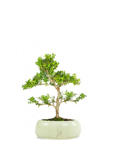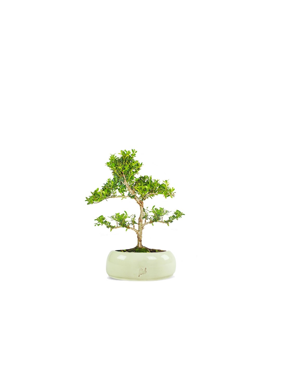I fiori piccoli e bianchi sbocciano in maggio-giugno, in gruppi di 3 o 5 mentre i frutti compaiono in settembre-ottobre e sono piccole bacche nere e lucide. Questo bonsai inoltre non richiede particolari attenzioni per vivere in salute.