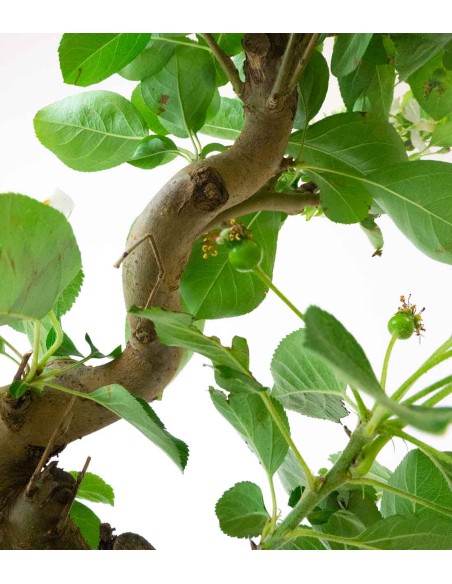 Questo esemplare di bonsai di Melo ha 12 anni, il tronco è particolarmente bello e sinuoso, la corteccia chiara e rugosa. Il suo aspetto è rustico ma con un portamento elegante.