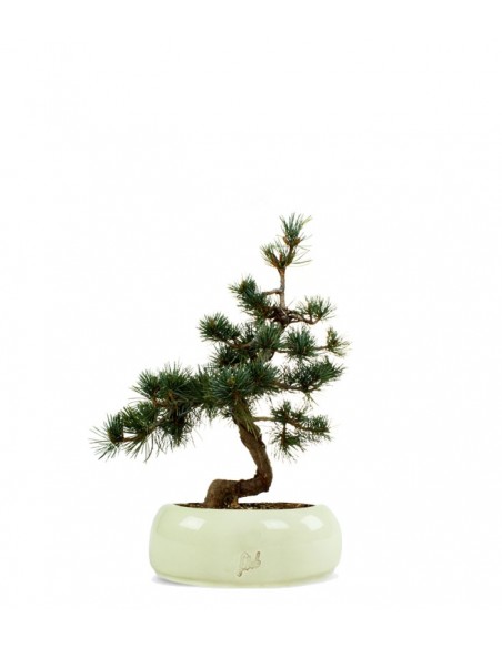 È una nota variante del Pino Parviflora ed è conosciuto anche come Pino a 5 aghi, Pino bianco e "goya-matsu" in Giappone. In natura raggiunge i 25-30 m di altezza e rappresenta la conifera più utilizzata come bonsai. Ha un tronco eretto e tortuoso, una chioma di forma piramidale folta e ben ramificata e aghi di colore verde-azzurro che si uniscono a gruppi di 5, da cui il nome. Esiste anche una sottospecie con aghi verdi più corti e sottili chiamata "Kokonoe". Ama luoghi soleggiati e ben ventilati e non teme né il caldo né il freddo, sebbene, in caso di gelo, sia meglio coprire il vaso con tnt. Richiede annaffiature periodiche, soprattutto se tenuto all'interno, ma è importante evitare i ristagni d'acqua. La potatura va effettuata in inverno, il rinvaso ogni 3-5 anni. È una specie molto longeva, tanto da essere tramandata di generazione in generazione nei paesi d'origine, e diventa sempre più bella col passare del tempo. All'interno del National Arboretum di Washigton DC è custodito un esemplare di oltre 390 anni: il pino bianco fu donato agli Stati Uniti nel 1975 da Masaru Yamaki, un maestro bonsai, per le celebrazioni del bicentenario della fondazione degli USA.