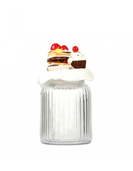 Vaso in vetro con coperchio in ceramica decorato a forma di biscotti e torta.