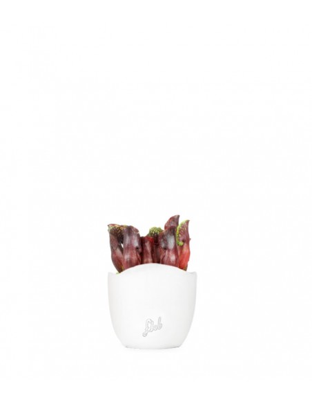 I suoi ascidi, e cioè le foglie coniche destinate a intrappolare gli insetti, sono di un rosso acceso impreziosito da screziature verde che si diffondono sulla superficie fogliare come lingue di fuoco. Un effetto scenico sicuramente ben riuscito che, oltre a catturare insetti in natura, provvederà a conquistare l'interesse delle persone. Sarracenia ama essere coltivata all'aperto e decorare terrazze o giardini con piccole torbiere, all'interno delle quali dà il meglio di sé. Il sole diretto le è gradito perché le permette di intensificare ulteriormente le sue tinte e, in ugual misura, predilige gli ambienti umidi: posizionatela quindi in un sottovaso con un po' di acqua, evitando quella calcarea e utilizzando al suo posto quella piovana o la demineralizzata. Di tanto in tanto una leggera spruzzata sulle foglie contribuirà a mantenere un buon livello di umidità intorno alla Sarracenia. Trattandosi di una pianta carnivora non richiede fertilizzante; per quanto riguarda il suo clima ideale, soffre a temperature superiori ai 37°C mentre, durante il riposo vegetativo invernale, va protetta da quelle inferiori allo zero.