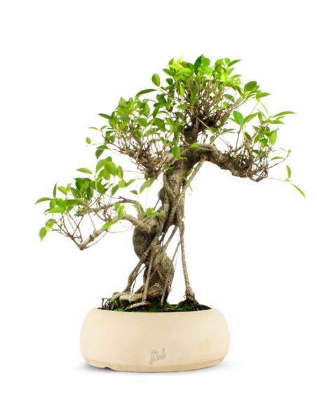 Il tronco è di colore biancastro, mentre il fogliame ha una bella tonalita? di verde intenso ed ogni foglia ha forma ovale ed appuntita. L'aspetto maggiormente caratterizzante di questa pianta sono le spettacolari radici, che creano un affascinante groviglio fuori terra, e proprio per questo è uno dei bonsai che più si adatta allo stile giapponese “Neagari”, ovvero a radici esposte. Inoltre, dai rami spesso partono altre radici aeree, che una volta raggiunta terra formano degli ulteriori tronchi. Il Ficus retusa è particolarmente indicato a chi vuole avvicinarsi al mondo dei bonsai, le sue caratteristiche da pianta da appartamento e la sua longevità lo rendono ideale per coltivare questa passione.