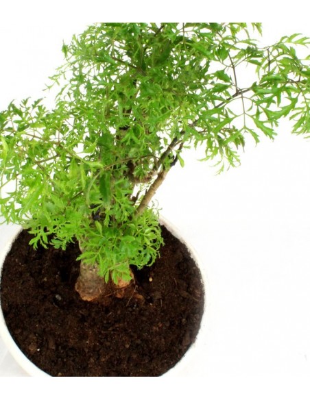 La Polyscias Fruticosa, conosciuta anche come Ming Aralia è una pianta da appartamento di facile coltivazione. Trae le sue origini in India, e presenta un portamento cespuglioso. Questa pianta da interno può raggiungere altezze fino a 1-2 metri, ma nella coltivazione a bonsai conserva l'aspetto di un affascinante albero in miniatura senza dover essere "guidato" nella crescita come tutti gli altri bonsai. I rami si sviluppano ad intervalli regolari nel tronco in posizione verticale, dandogli una forma "a baldacchino" e d'estate producomo piccoli fiori. Una particolarità della pianta Polyscias Fruticosa è che i rami più vecchi, alla base, tendono a seccarsi lasciando cicatrici, che però danno alla pianta un aspetto ancora più attraente! Questa versione con vaso a ciotola in pregiata terracotta toscana le conferisce un tocco inusuale e innovativo.