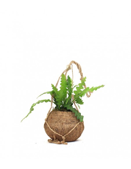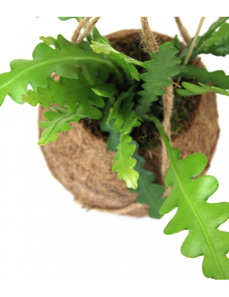 Ephypillum anguliger è una pianta succulenta, della famiglia delle cactacee, originaria del Messico. La peculiarità di questo genere di piante è che non possiedono rami ed i fiori crescono direttamente dal fusto delle foglie: da qui il suo nome, che significa proprio “sopra la foglia”. I suoi margini frastagliati la rendono simile ad altre piante come alcune felci, ma ne differisce proprio per essere una succulenta: se osserviamo bene le sue foglie sono spesse e di aspetto ceroso. I fiori di questo Ephiphyllum sono molto appariscenti e di colore solitamente bianco. Nel vaso di fibra di cocco la tecnica giapponese di appendere le piante dentro una “palla” di terriccio rivive in forma moderna. Il contenitore è infatti completamente naturale e biodegradabile, così come il vasetto interno impermeabile. La corda vi consentirà di appenderlo in qualsiasi punto della vostra casa creando quindi un angolo green che meraviglierà chiunque.