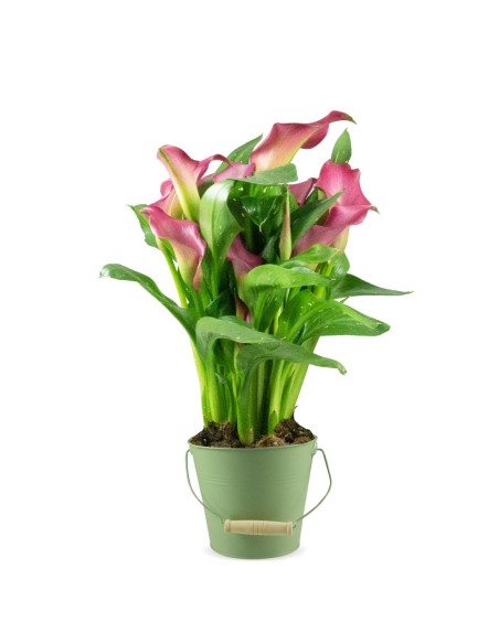 La calla in vaso presenta dei bellissimi fiori lunghi circa 10-15 cm a forma di campana (le spate) che avvolgono elegantemente lo spadice di color giallo intenso, simile ad una spiga. Le stesse foglie, grandi e con lunghi gambi di color verde intenso, danno risalto ai fiori che spiccano con i loro colori.