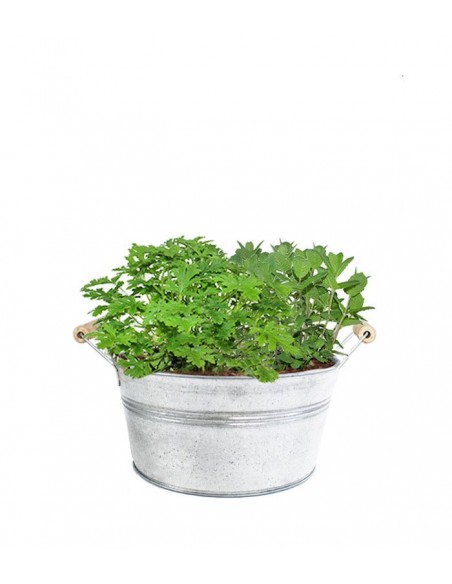 Il vaso è in latta grigia con raffinanta zigrinatura, fiocchetto in raffia e laccio superiore in juta che si avvolge al vaso e possiede due manici.