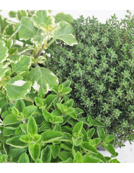 Il Timo è un'essenza utilizzata fin dalle epoche antiche per scopi soprattutto medicinali, in particolare come antibiotico naturale per combattere tutti i malanni delle vie respiratorie. Esistono moltissime di varietà del Timo: in questa composizione troviamo il timo variegato con foglie molto minute di colore verde scuro e giallo. Appartiene alla stessa famiglia della lavanda ed è usato in maniera molto ampia anche in cucina, per guarnire carni e pesci o anche per preparare ottimi liquori. Si tratta di un'erba aromatica molto resistente che risente pochissimo di sbalzi di temperatura: l'importante è posizionarlo in una zona molto luminosa. Il terreno ideale per il Timo è misto e ricco di sostanza organica, e dovrebbe lasciar traspirare molto la pianta. Non necessita di irrigazione eccessiva, che potrebbe causare muffe e attirare insetti.