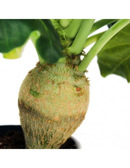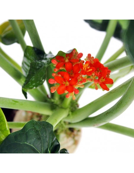 Si tratta di un'insolita pianta esotica, una succulente originaria dell'America Centrale. Il suo nome deriva dal greco “iatròs” che significa medico e “trophè” alimento, in riferimento alle sue conclamate proprietà medicinali. La Jatropha podagrica possiede un tronco gonfio, nodoso e di colore chiaro che funge da riserva d'acqua. Per questa sua particolare conformazione, nei Paesi anglosassoni la pianta è denominata baseball cactus, ma è conosciuta anche col nome di pancia di Buddha. Le foglie palmate lucide e di una tinta verde brillante contrastano con i fiori rosso corallo, raccolti insieme a forma di ombrello, che sbocciano in primavera-estate. Una sua particolarità sono i frutti, tondeggianti e legnosi, simili a delle piccole noci di cocco. La Jatropha podagrica, è una pianta che grazie al suo aspetto estetico accattivante è molto ricercata dagli appassionati ma anche apprezzata dagli interior designer per il suo alto valore ornamentale e decorativo. Ricordiamo che tutte le parti della pianta sono tossiche se ingerite.
