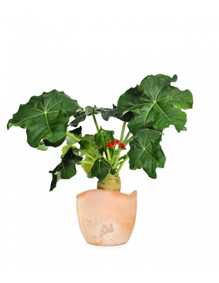 Si tratta di un'insolita pianta esotica, una succulente originaria dell'America Centrale. Il suo nome deriva dal greco “iatròs” che significa medico e “trophè” alimento, in riferimento alle sue conclamate proprietà medicinali. La Jatropha podagrica possiede un tronco gonfio, nodoso e di colore chiaro che funge da riserva d'acqua. Per questa sua particolare conformazione, nei Paesi anglosassoni la pianta è denominata baseball cactus, ma è conosciuta anche col nome di pancia di Buddha. Le foglie palmate lucide e di una tinta verde brillante contrastano con i fiori rosso corallo, raccolti insieme a forma di ombrello, che sbocciano in primavera-estate. Una sua particolarità sono i frutti, tondeggianti e legnosi, simili a delle piccole noci di cocco. La Jatropha podagrica, è una pianta che grazie al suo aspetto estetico accattivante è molto ricercata dagli appassionati ma anche apprezzata dagli interior designer per il suo alto valore ornamentale e decorativo. Ricordiamo che tutte le parti della pianta sono tossiche se ingerite.