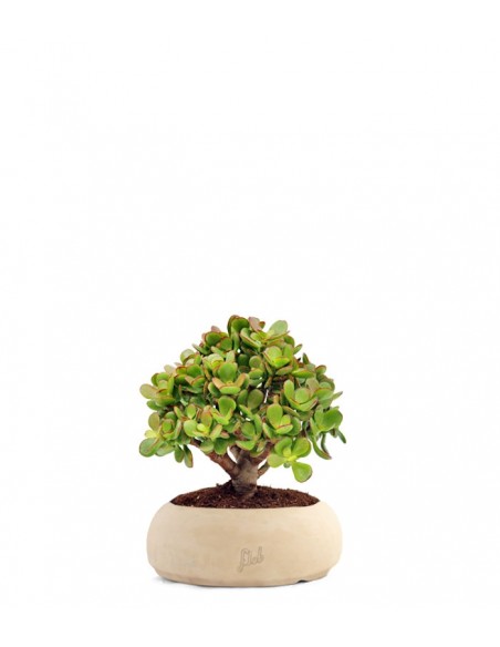 Nota anche come albero di Giada, la crassula Ovata è una succulenta di origine africana. Nel suo habitat naturale cresce rigogliosa fino a raggiungere imponenti dimensioni. In questo caso, trattandosi di un bonsai, risulta una piccola ma vigorosa scultura vegetale, caratterizzata da foglie ovali e carnose di un bellissimo verde brillante e bordi rossastri. La fioritura avviene tra la primavera e l'estate e i fiori, di colore rosa o bianco a forma di stella, sono raggruppati in piccole inflorescenze poste agli apici dei rami.