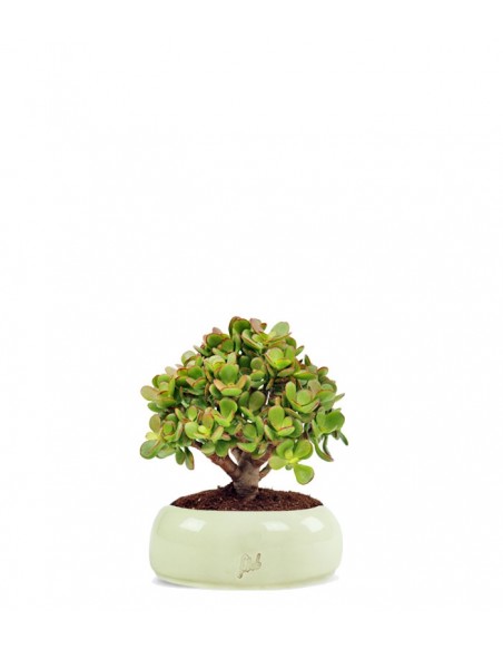 Nota anche come albero di Giada, la crassula Ovata è una succulenta di origine africana. Nel suo habitat naturale cresce rigogliosa fino a raggiungere imponenti dimensioni. In questo caso, trattandosi di un bonsai, risulta una piccola ma vigorosa scultura vegetale, caratterizzata da foglie ovali e carnose di un bellissimo verde brillante e bordi rossastri. La fioritura avviene tra la primavera e l'estate e i fiori, di colore rosa o bianco a forma di stella, sono raggruppati in piccole inflorescenze poste agli apici dei rami.