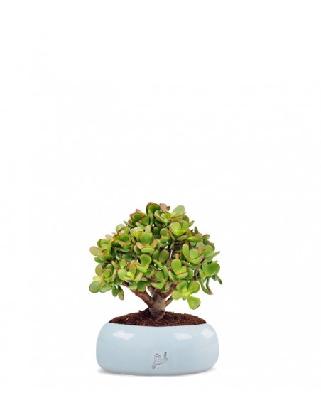 Nota anche come albero di Giada, la crassula Ovata è una succulenta di origine africana. Nel suo habitat naturale cresce rigogliosa fino a raggiungere imponenti dimensioni. In questo caso, trattandosi di un bonsai, risulta una piccola ma vigorosa scultura vegetale, caratterizzata da foglie ovali e carnose di un bellissimo verde brillante e bordi rossastri. La fioritura avviene tra la primavera e l'estate e i fiori, di colore rosa o bianco a forma di stella, sono raggruppati in piccole inflorescenze poste agli apici dei rami.