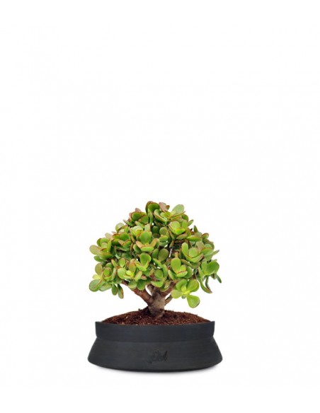 Nota anche come albero di Giada, la crassula Ovata è una succulenta di origine africana. Nel suo habitat naturale cresce rigogliosa fino a raggiungere imponenti dimensioni. In questo caso, trattandosi di un bonsai, risulta una piccola ma vigorosa scultura vegetale, caratterizzata da foglie ovali e carnose di un bellissimo verde brillante e bordi rossastri. La fioritura avviene tra la primavera e l'estate e i fiori, di colore rosa o bianco a forma di stella, sono raggruppati in piccole inflorescenze poste agli apici dei rami.