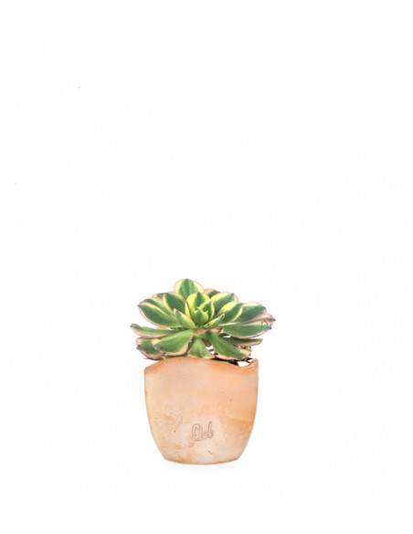 Il genere Aeonium comprende tutte quelle succulente con il classico aspetto “a rosetta” e che con la crescita assumono le apparenze di un piccolo arbusto. Nel caso dell'Aeonium arboreum variegato, le foglie assumono una deliziosa bordatura giallo-rosacea che la vivacizza in modo evidente. Sono foglie tipiche del genere Aeonium, quindi concave nella parte alta, al contrario del genere Echeveria in cui si presentano convesse sia nella pagina superiore che in quella inferore. I colori di questo Aeonium si fanno ancora più notevoli se uniti al vaso Flob artigianale in terracotta. Dal centro della rosetta si sviluppano fiori di colore variabile. La particolarità è che dopo la fioritura la rosetta muore, avendo però lasciato già spazio ai lati per la crescita di nuove rosette.