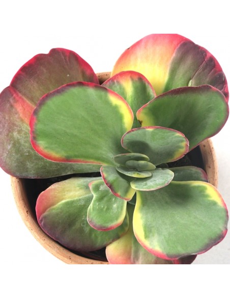 La Kalanchoe Thyrsiflora variegata è una succulenta nativa dell'Africa meridionale e del Madagascar. La sua particolarità sta proprio nelle foglie: a forma lobata ma molto larghe, piatte e con colori decisamente tropicali: il giallo e il rosso si affiancano al verde e creano sfumature incredibili. E' una succulenta che seppur nelle sue piccole dimensioni si dimostra un'ottima protagonista se inserita nel vostro angolo di piante grasse, insieme a questo vaso in terracotta di fattura artigianale che gli conferisce un aspetto moderno e sbarazzino. In estate produce fiori tubulari simili a quelli delle echeverie. Inoltre la Kalanchoe ha anche un importante significato: Regalare una di queste sempreverdi equivale a fare un augurio per l'abitazione dove la persona vive o andrà a vivere.