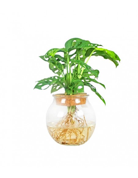 Le piante in idrocoltura in vasi di vetro sono ormai un vero trend nelle case e nei reportage di interni. In questo caso si tratta di un filodendro monkey mask, una pianta sempreverde e rampicante, originaria delle zone tropicali dell'America centrale e meridionale. Presenta foglie di colore verde intenso lucido con lamina perforata in modo regolare o irregolare. Deve il suo nome proprio al fogliame particolare che ricorda la faccia di una scimmia. Un oggetto dal design essenziale ma al contempo particolare, con il quale potrete donare all'arredamento di casa un'atmosfera tropicale. Il colpo d'occhio sarà assicurato. Aggiungiamo inoltre che il filodendro monkey mask è nella top 10 delle pianta in grado di migliorare la qualità dell'aria che respiriamo e limitare l'inquinamento domestico. Filtra molti agenti inquinanti tra cui la formaldeide, presente nei tappeti, nei mobili e nei prodotti per la pulizia della casa, efficace contro le onde elettromagnetiche