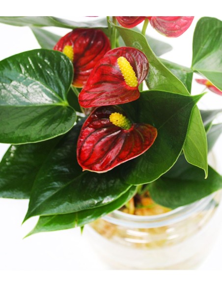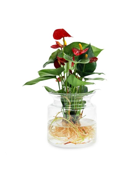 Le piante in idrocoltura sono ormai un vero trend nelle case e nei reportage di interni. In questo caso si tratta di un anthurium andreanum, una pianta sempreverde originaria della Colombia. Presenta foglie di colore verde intenso lucido e fiori appariscenti ed eleganti. Questi ultimi sono composti da una spata colorata, che deriva in realtà da una trasformazione delle foglie, e da una spiga detta spadice che ha una forma cilindrica e che contiene i fiori veri e propri. Inoltre la bellezza delle radici viene enfatizzata dalla presenza del vaso in vetro. Un oggetto dal design essenziale in grado di donare un' atmosfera inusuale al vostro ambiente interno. Un'idea di tendenza, nuova ed originale, perfetta anche come regalo!