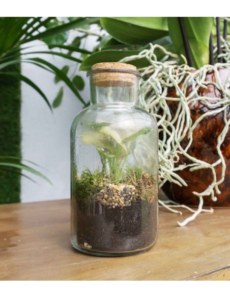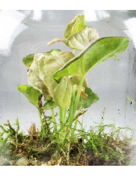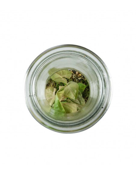 Una piccola pianta di Singonio inserita all'interno di un barattolo in vetro sigillato ermeticamente che diviene un vero e proprio ecosistema in miniatura. Si tratta di pianta elegante e raffinata le cui foglie spiccano per il colore rosa e la forma a cuore. Il Singonio provienedall'America centrale e meridionale dove le popolazioni giamaicane gli attribuiscono addirittura poteri divini, infatti a seconda dello stato delle foglie sarebbe in grado di predire il futuro.