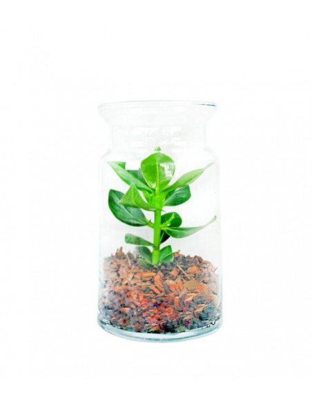 Tra gli allestimenti “verdi” più belli e di tendenza, che si possono utilizzare per conferire agli spazi di casa un'atmosfera naturale senza grandi sforzi, troviamo i terrari, che rappresentano un'alternativa molto moderna e altrettanto decorativa. Una mini oasi che può essere sistemata in un angolo della casa, sulla scrivania, piuttosto che diventare un bellissimo centro tavola o un prezioso oggetto decorativo nella stanza da letto oppure in quella da bagno. In questo caso, all'interno del barattolo in vetro, troviamo una pianta di clusia. Si tratta di un arbusto dalle foglie verdi, tondeggianti e lucide che in natura vive nelle foreste dell'America Centrale. In natura produce, durante la stagione estiva, mazzetti di fiori color rosa-crema e può crescere fino a 2-3 metri in altezza.