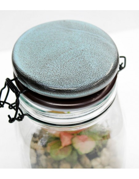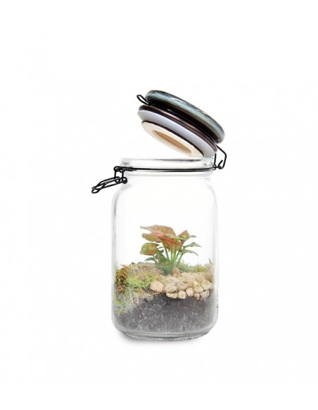 La sua cura non richiede particolari accortezze, poiché all'interno del barattolo vengono ricreate le condizioni ottimali per la crescita della pianta stessa, riciclando continuamente l'acqua e l'aria interna, imitando i biotopi naturali molto umidi. L'unica cosa di cui ha bisogno è un po' d'amore e un bel luogo in cui vivere! L' ideale sarebbe lontano da fonti di luce diretta e dove la temperatura è costante. Un indicatore affidabile per la buona posizione è la quantità di condensa che si crea sul vetro. La condizione perfetta sarebbe quella di avere un lato coperto e l'altro no. Nel caso in cui la condensa fosse presente in quantità elevata basterà aprire il vostro contenitore e toglierla con un panno asciutto. Esposta all'interno di questo barattolo in vetro, la pianta di Singonio diventa preziosa come se fosse un pezzo da museo. Un complemento d'arredo dall'indiscusso effetto scenico in grado di donare un tocco di stile alla vostra casa!