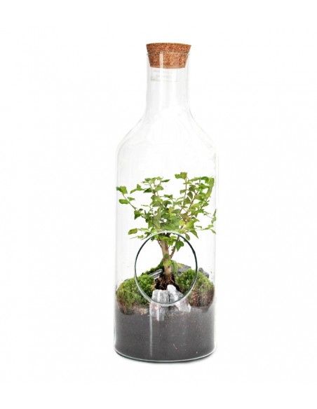 Il ligustro è una pianta di origini asiatiche molto diffusa anche in Europa, dove viene spesso viene utilizzato per realizzare siepi. Arbusto della famiglia delle Oleaceae, ha un aspetto particolarmente ricco di rami, fattore che, unito alle sue deliziose foglioline, piccole, tondeggianti e lucide, lo ha reso ideale per la coltura bonsai. La fioritura, che non si manifesta con frequenza, vede apparire dei fiorellini bianchi raccolti in piccole pannocchie. In questo caso ritroviamo il ligustro inserito all'interno di una sorta di giardino in bottiglia. Una mini oasi che può essere sistemata in ogni angolo della vostra casa, sulla scrivania, piuttosto che diventare un oggetto decorativo molto particolare da inserire nella stanza da letto. Esposta all'interno di questa bottiglia in vetro, la pianta di ligustro diventa elemento quasi prezioso ed elegante, un complemento di design green in grado di conferire ai vostri spazi un tocco scenico e moderno.