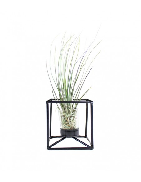 Una piccola tillandsia inserita all'interno di una struttura in metallo color nero, dalle forme geometriche eleganti e moderne che vi consentiranno di ammirare la vostra pianta a 360°. Le tillandsie comparvero anni fa nei salotti delle nostre nonne come ornamento per tavolini o vecchie credenze, oggi invece assumono una nuova connotazione moderna diventando un complemento d'arredo di design. Un vero e proprio must have che vi consentirà di aggiungere un tocco decorativo a qualsiasi ambiente della vostra casa. Le tillandsie vivono senza terra e proprio per la loro capacità di “nutrirsi d'aria” in natura si trovano ovunque, sulle rocce e sugli alberi ricreando affascinanti sculture viventi. Trattandosi appunto di una pianta aerea, la sua cura non richiede grandi accortezze, se non quella di spruzzare leggermente la tillandsia una volta alla settimana. Sarebbe bene posizionarla in una zona luminosa ma lontana dai raggi diretti del sole.